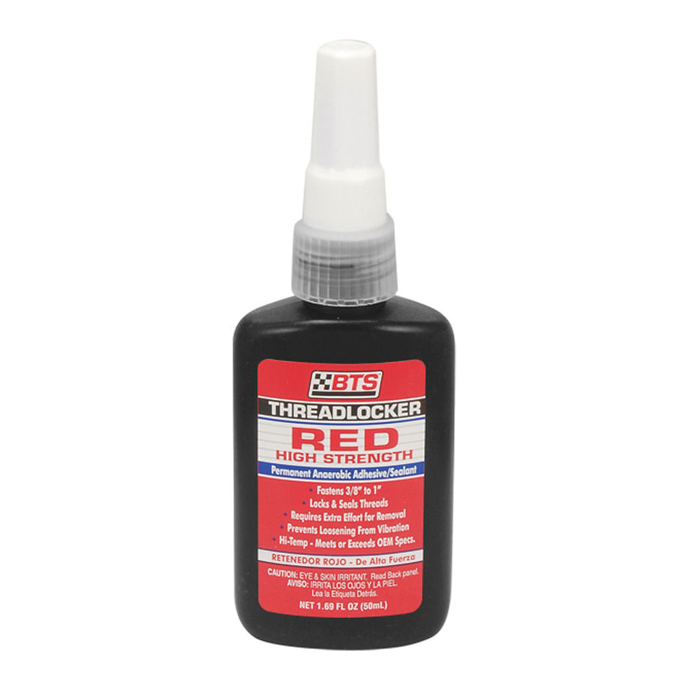 BTS Red Threadlocker is a high strength, single-component anaerobic threadlocking adhesive. It locks and seals threaded and press fit assemblies to prevent leakage and loosening due vibration. Suitable for use in high stress, shock, and vibration applications. It resists oils, glycol & water, transmission fluid & mild acids.